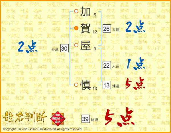 加賀屋慎さんの総運は39画の5点!