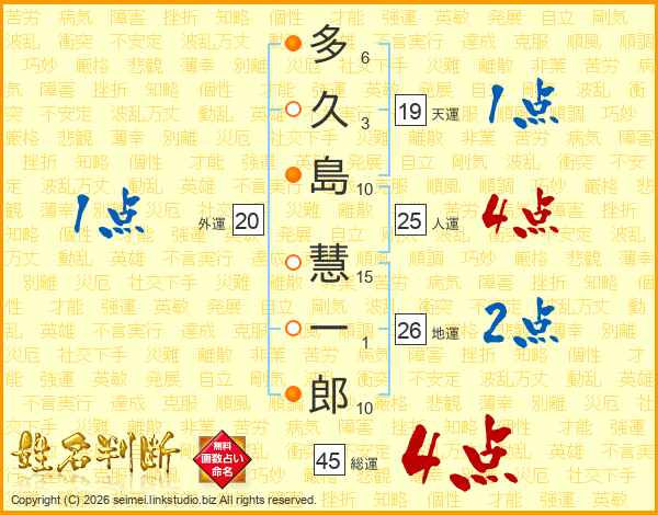 多(6画)久(3画)島(10画) 慧(15画)一(1画)郎(10画)