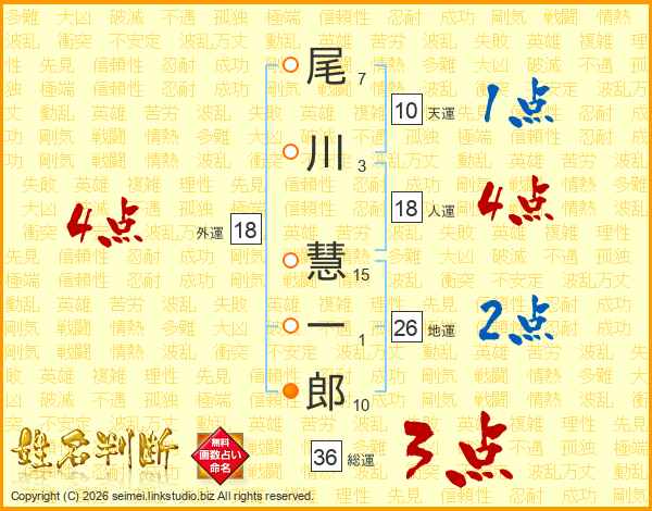 尾(7画)川(3画) 慧(15画)一(1画)郎(10画)