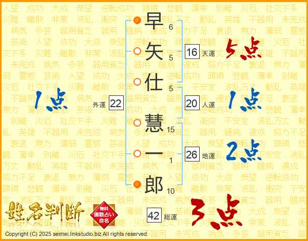 早(6画)矢(5画)仕(5画) 慧(15画)一(1画)郎(10画)
