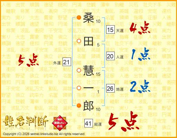 桑(10画)田(5画) 慧(15画)一(1画)郎(10画)