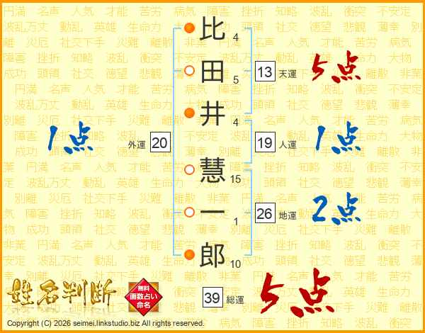 比田井慧一郎さんの総運は39画の5点!
