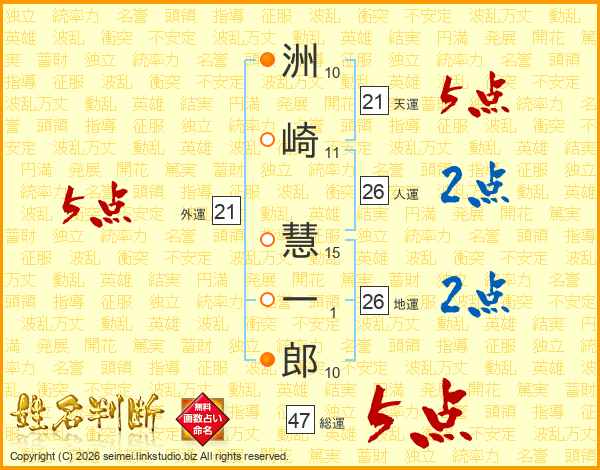洲(10画)崎(11画) 慧(15画)一(1画)郎(10画)