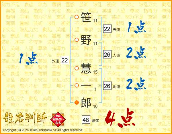 笹(11画)野(11画) 慧(15画)一(1画)郎(10画)