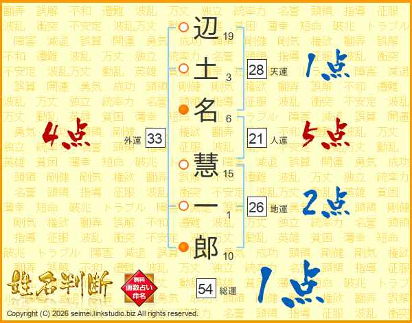 辺(19画)土(3画)名(6画) 慧(15画)一(1画)郎(10画)