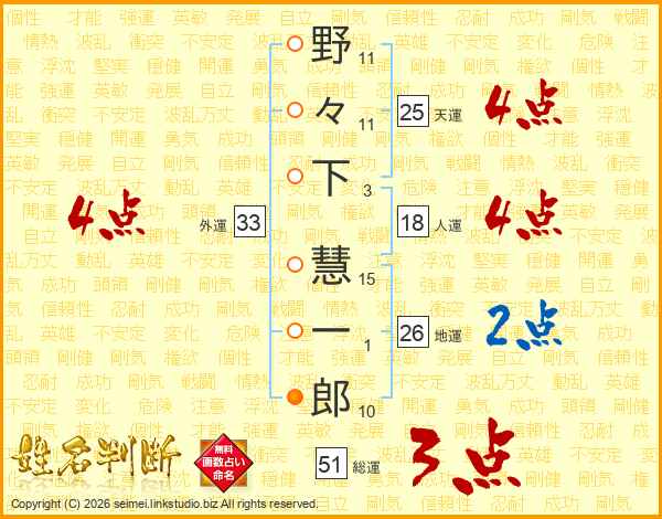 野(11画)々(11画)下(3画) 慧(15画)一(1画)郎(10画)