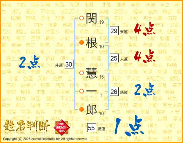 関(19画)根(10画) 慧(15画)一(1画)郎(10画)