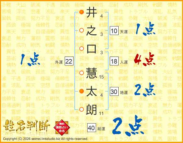 井(4画)之(3画)口(3画) 慧(15画)太(4画)朗(11画)