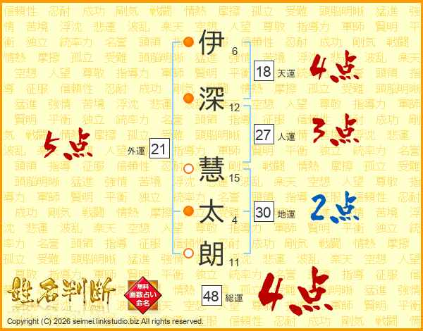 伊(6画)深(12画) 慧(15画)太(4画)朗(11画)