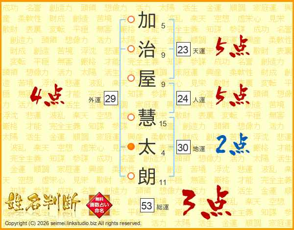 加(5画)治(9画)屋(9画) 慧(15画)太(4画)朗(11画)