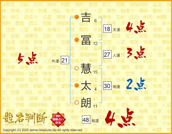 吉(6画)冨(12画) 慧(15画)太(4画)朗(11画)