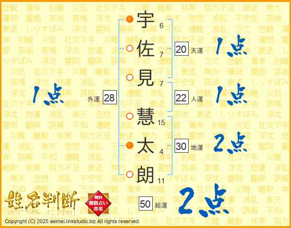 宇(6画)佐(7画)見(7画) 慧(15画)太(4画)朗(11画)