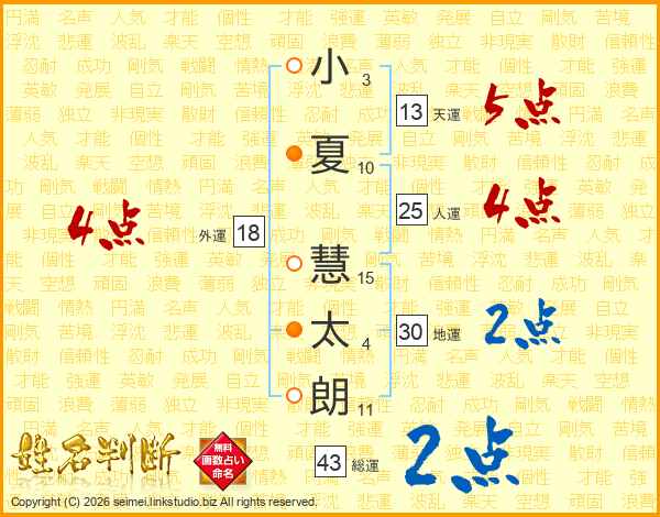 小(3画)夏(10画) 慧(15画)太(4画)朗(11画)