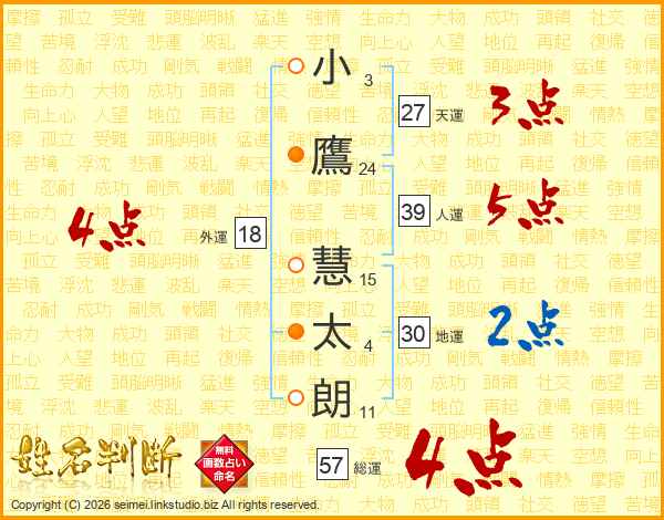 小(3画)鷹(24画) 慧(15画)太(4画)朗(11画)