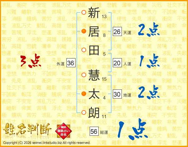 新(13画)居(8画)田(5画) 慧(15画)太(4画)朗(11画)