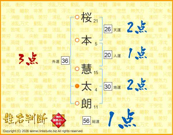 桜(21画)本(5画) 慧(15画)太(4画)朗(11画)