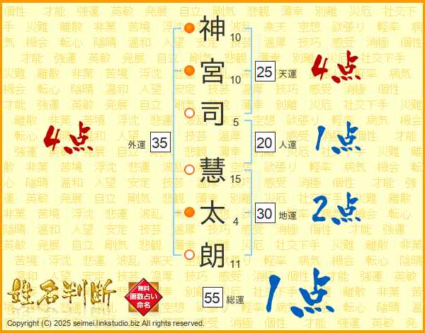 神(10画)宮(10画)司(5画) 慧(15画)太(4画)朗(11画)