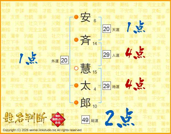 安(6画)斉(14画) 慧(15画)太(4画)郎(10画)