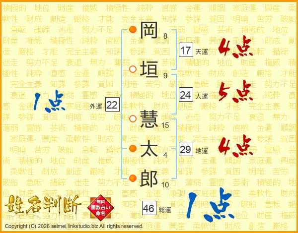 岡(8画)垣(9画) 慧(15画)太(4画)郎(10画)