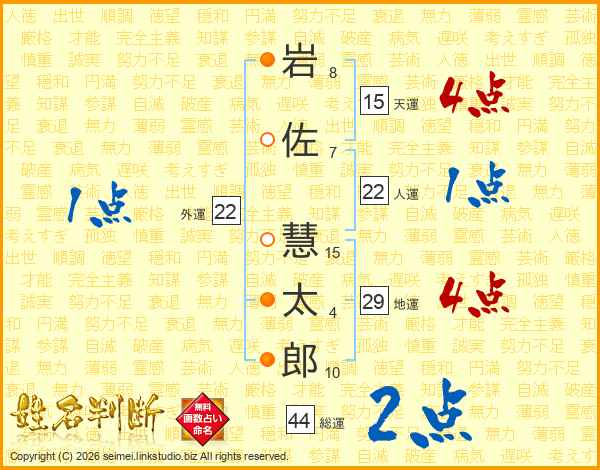 岩(8画)佐(7画) 慧(15画)太(4画)郎(10画)