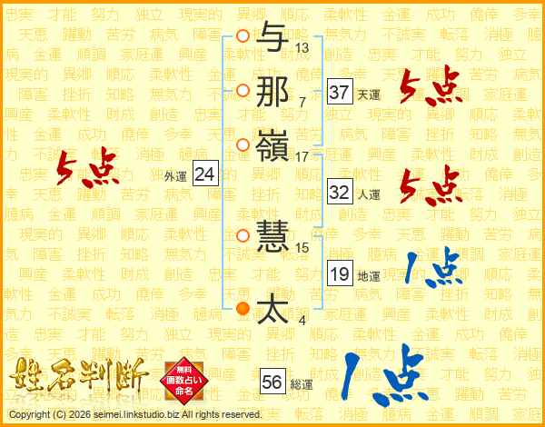 与(13画)那(7画)嶺(17画) 慧(15画)太(4画)