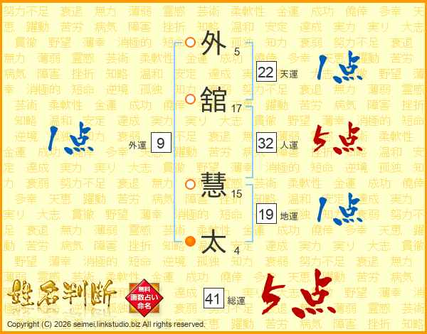 生活面を象徴する運勢です。外部から受ける影響力を表し、結婚運、家庭運や職場、環境への順応性を表します。総運から人運を引いた画数。姓や名が1文字の場合を除く。