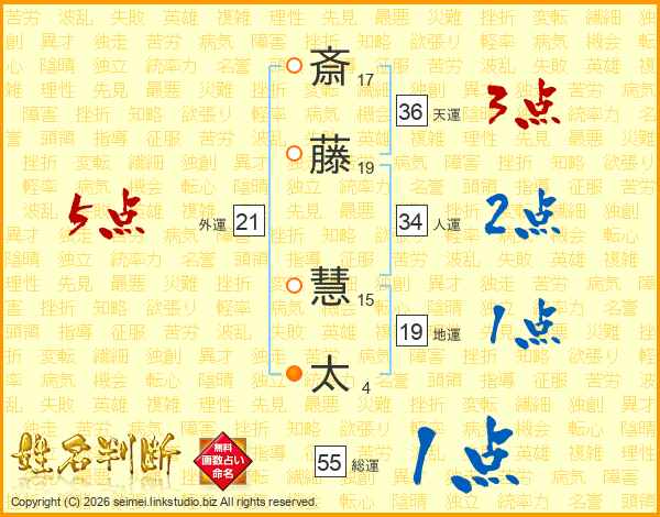 斎(17画)藤(19画) 慧(15画)太(4画)