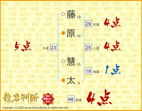 家系が持つ宿命的な運勢を表します。祖先から受け継いだ苗字ですので自分の力が及びません。家柄を象徴します。苗字の合計画数。