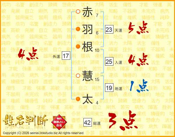 赤(7画)羽(6画)根(10画) 慧(15画)太(4画)