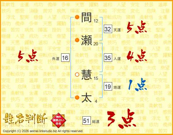 間(12画)瀬(20画) 慧(15画)太(4画)