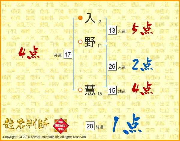 生活面を象徴する運勢です。外部から受ける影響力を表し、結婚運、家庭運や職場、環境への順応性を表します。総運から人運を引いた画数。姓や名が1文字の場合を除く。