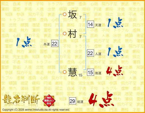 坂(7画)村(7画) 慧(15画)