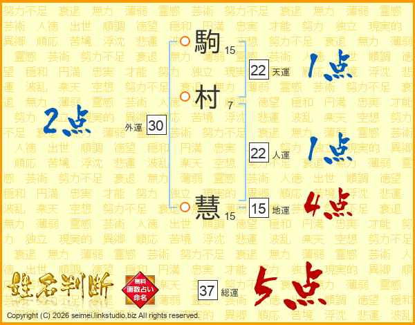 家系が持つ宿命的な運勢を表します。祖先から受け継いだ苗字ですので自分の力が及びません。家柄を象徴します。苗字の合計画数。