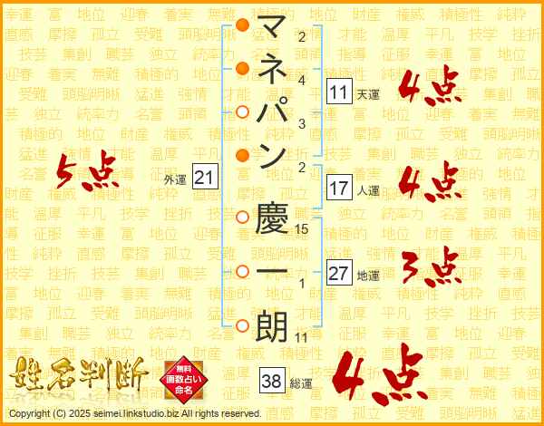 マ(2画)ネ(4画)パ(3画)ン(2画) 慶(15画)一(1画)朗(11画)