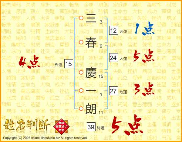 三(3画)春(9画) 慶(15画)一(1画)朗(11画)