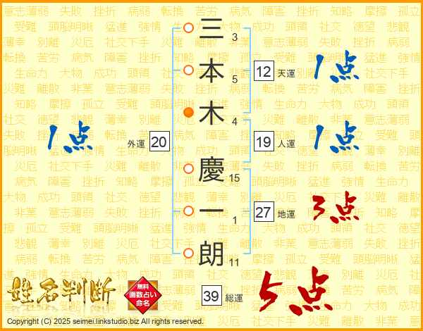 三(3画)本(5画)木(4画) 慶(15画)一(1画)朗(11画)