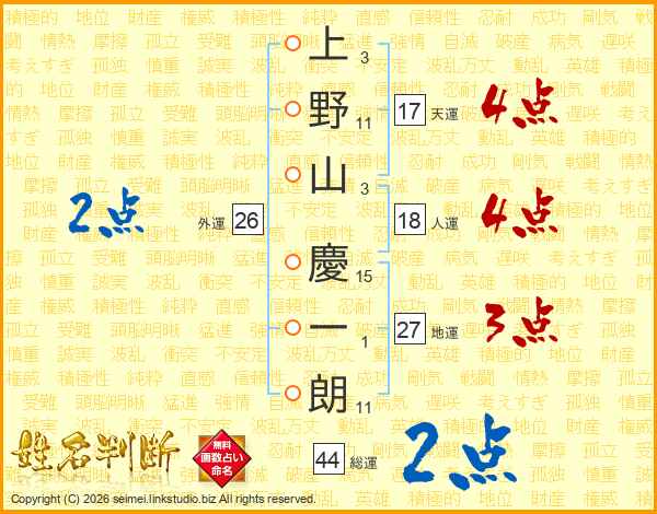 上(3画)野(11画)山(3画) 慶(15画)一(1画)朗(11画)