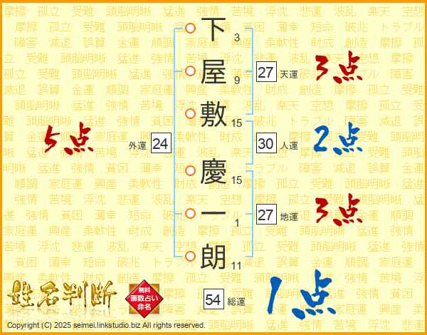 下(3画)屋(9画)敷(15画) 慶(15画)一(1画)朗(11画)