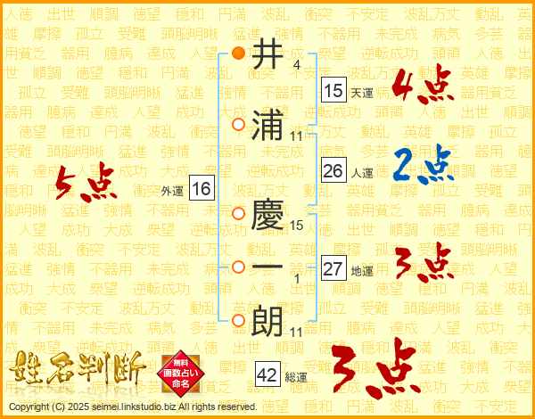 井(4画)浦(11画) 慶(15画)一(1画)朗(11画)