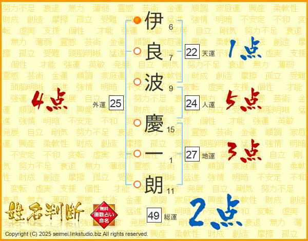 伊(6画)良(7画)波(9画) 慶(15画)一(1画)朗(11画)