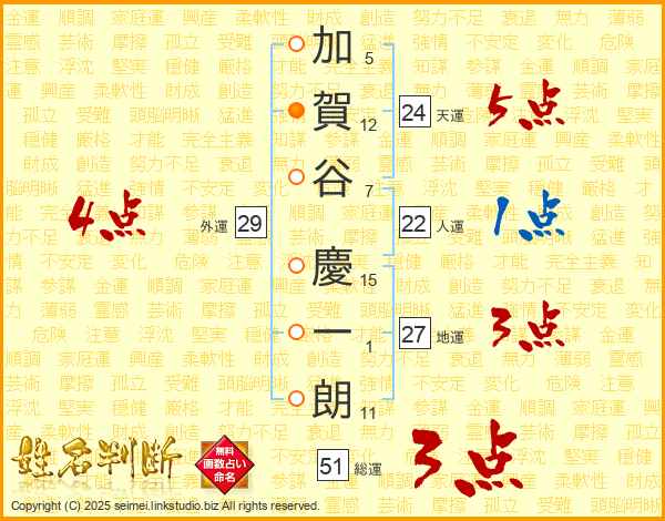 加(5画)賀(12画)谷(7画) 慶(15画)一(1画)朗(11画)