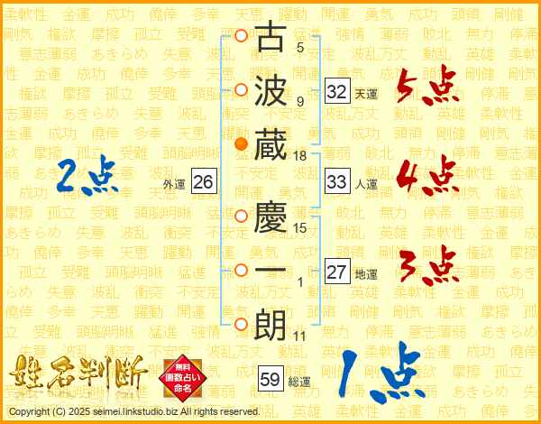 古(5画)波(9画)蔵(18画) 慶(15画)一(1画)朗(11画)