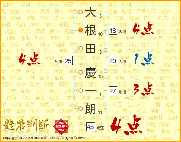 大(3画)根(10画)田(5画) 慶(15画)一(1画)朗(11画)