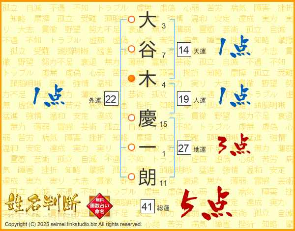 大(3画)谷(7画)木(4画) 慶(15画)一(1画)朗(11画)