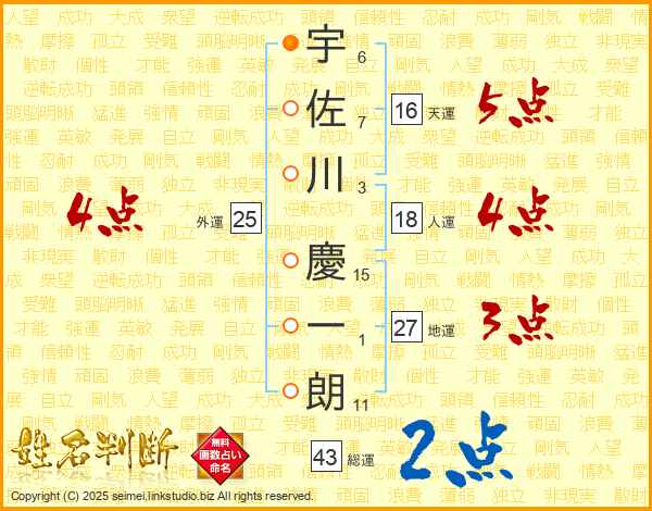 宇(6画)佐(7画)川(3画) 慶(15画)一(1画)朗(11画)