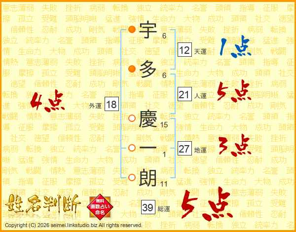 宇多慶一朗さんの総運は39画の5点!