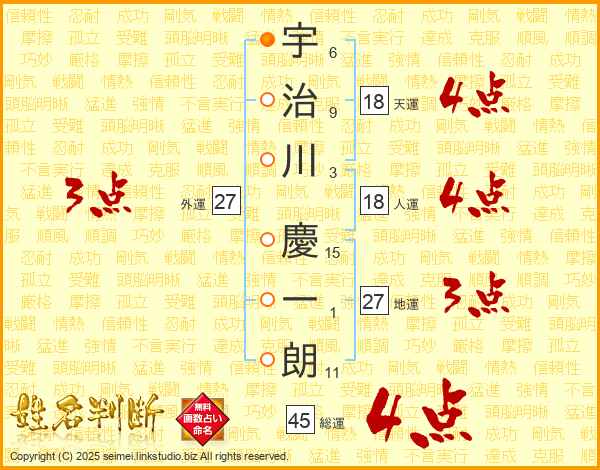 宇(6画)治(9画)川(3画) 慶(15画)一(1画)朗(11画)