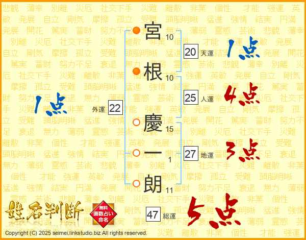 宮(10画)根(10画) 慶(15画)一(1画)朗(11画)