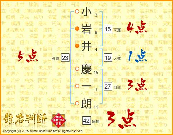 小(3画)岩(8画)井(4画) 慶(15画)一(1画)朗(11画)