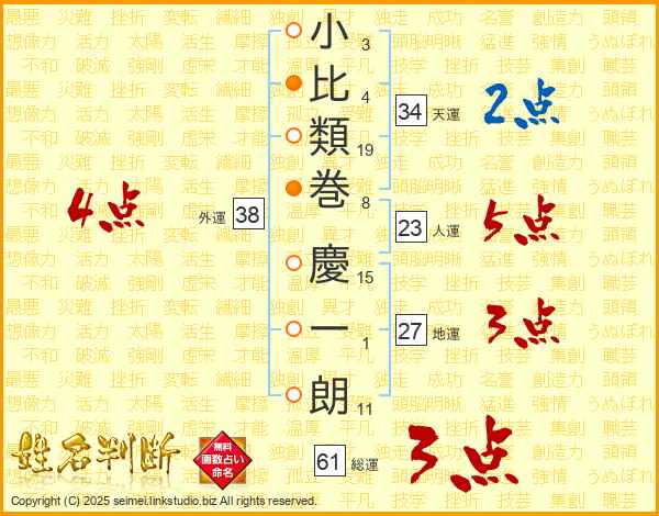 小(3画)比(4画)類(19画)巻(8画) 慶(15画)一(1画)朗(11画)